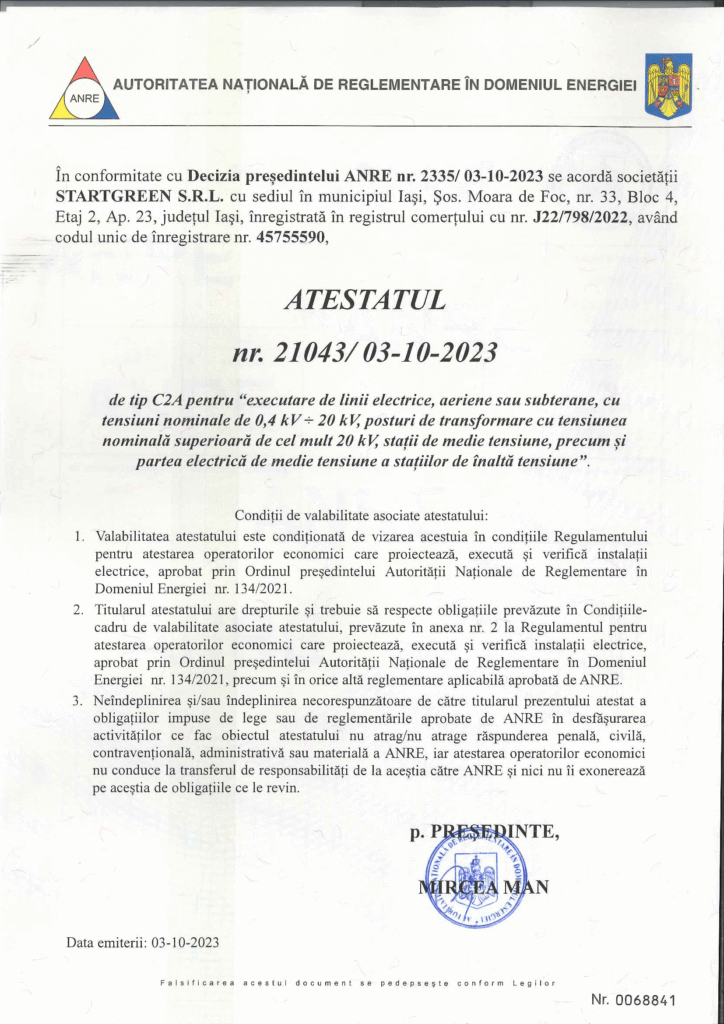 Da. Suntem autorizați ANRE și realizăm branșamente electrice, extinderi de rețea, instalații electrice interioare și exterioare pentru locuințe, hale industriale și spații comerciale, în toată România.